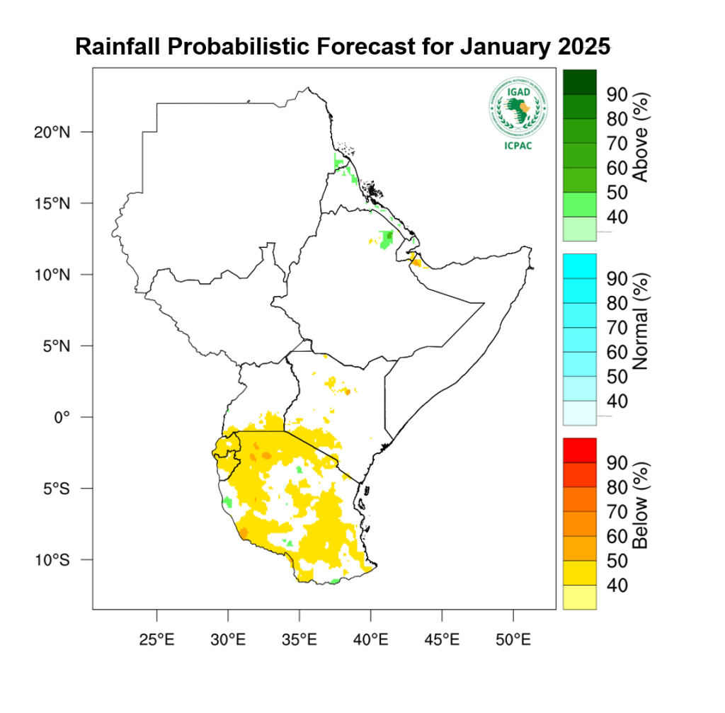 The month of January is projected to bring drier-than-normal conditions across large swathes of East Africa. Rwanda, Burundi, and most of Tanzania are set to experience significant dryness, while the rest of the region, including Kenya and Ethiopia, will remain predominantly dry.