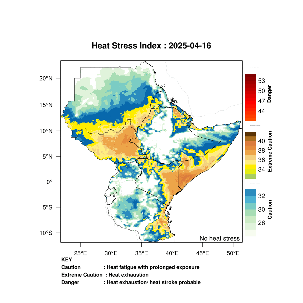 As the temperatures shift based on regions and locations divergently, heat stress possibilities exist in other regions. Elevated heat stress levels are expected in most parts of South Sudan, eastern Kenya, eastern Tanzania, central to southern Somalia, and southern regions of Sudan, and coastal regions of Eritrea.