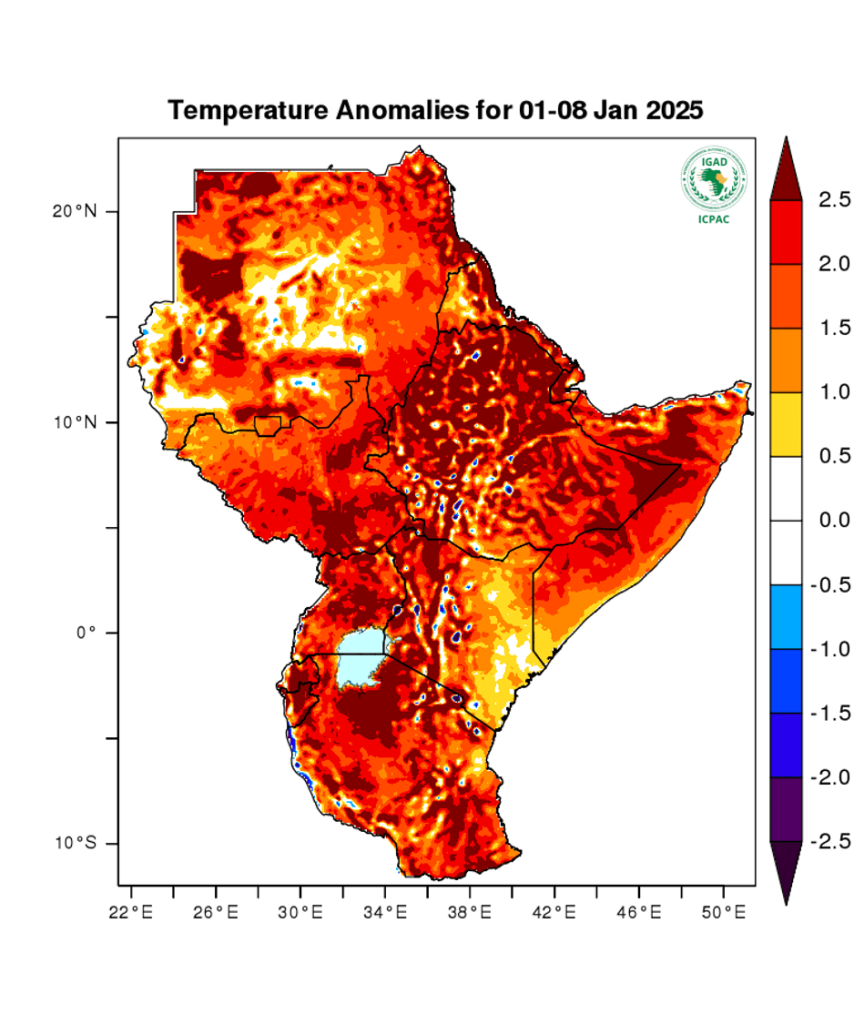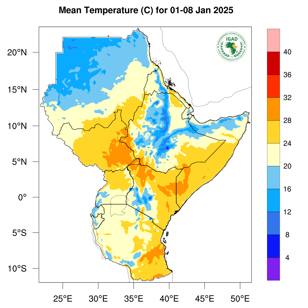 - Mild temperature conditions (less than 20℃) are expected over central to northern Sudan, central Ethiopia, northern Somalia, central to western Kenya, and western regions of Rwanda and Burundi.