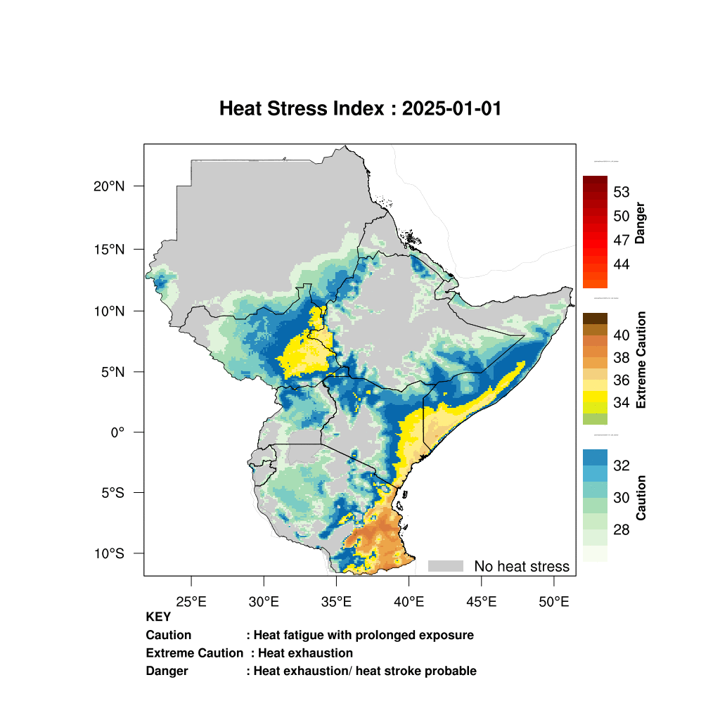 - Cautionary heat stress levels are expected over eastern regions of Tanzania and Kenya, southern Somalia, and eastern South Sudan.